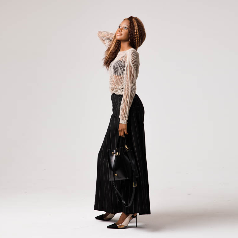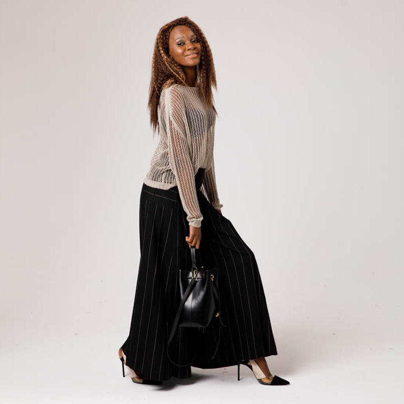 Особенности модели без аппликаций, одноцветное изделие в тонкую бежевую полоску, широкие брюки, молния , без карманов